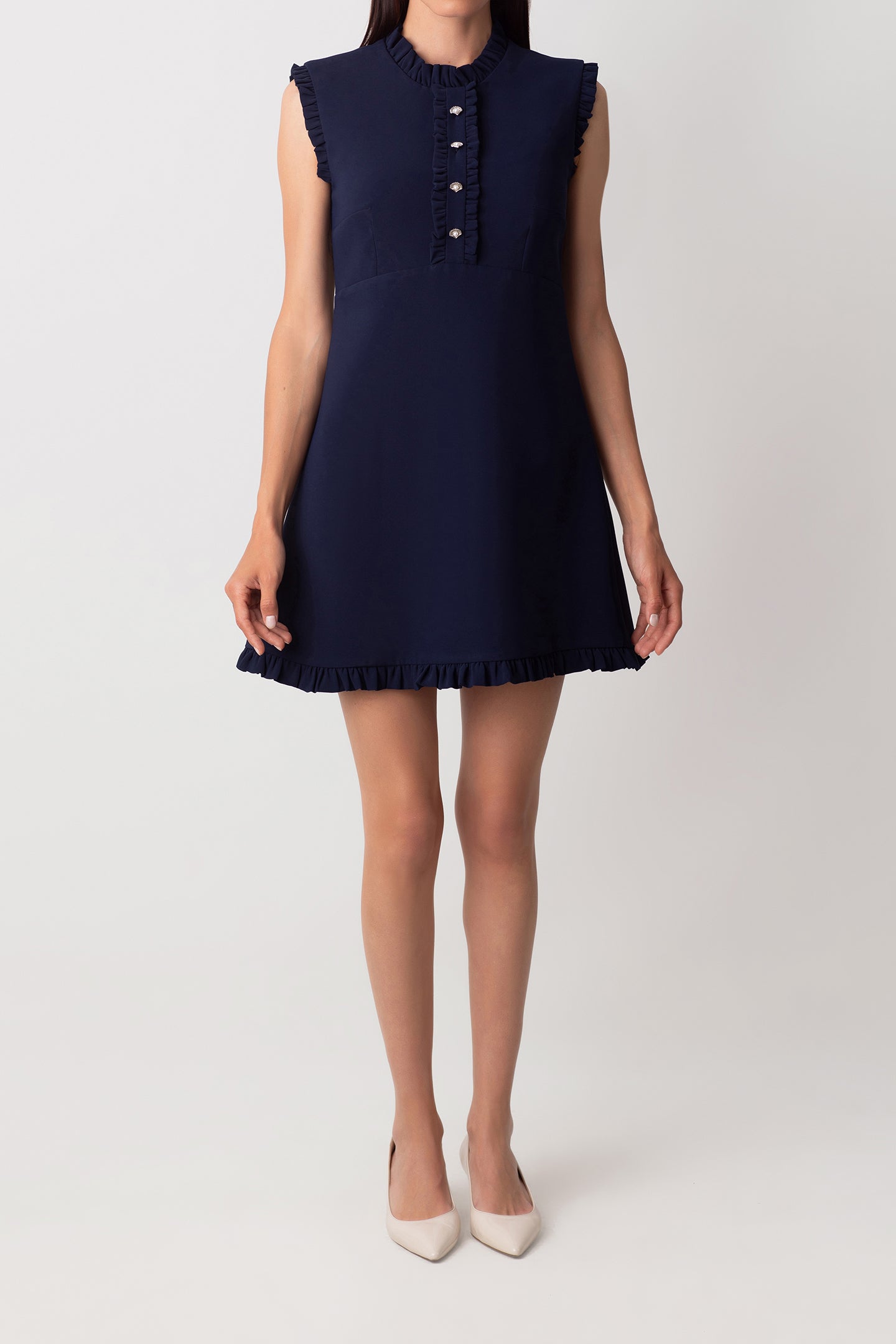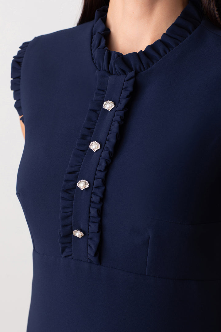 MANDARIN COLLAR RUFFLED NAVY BLUE DRESS