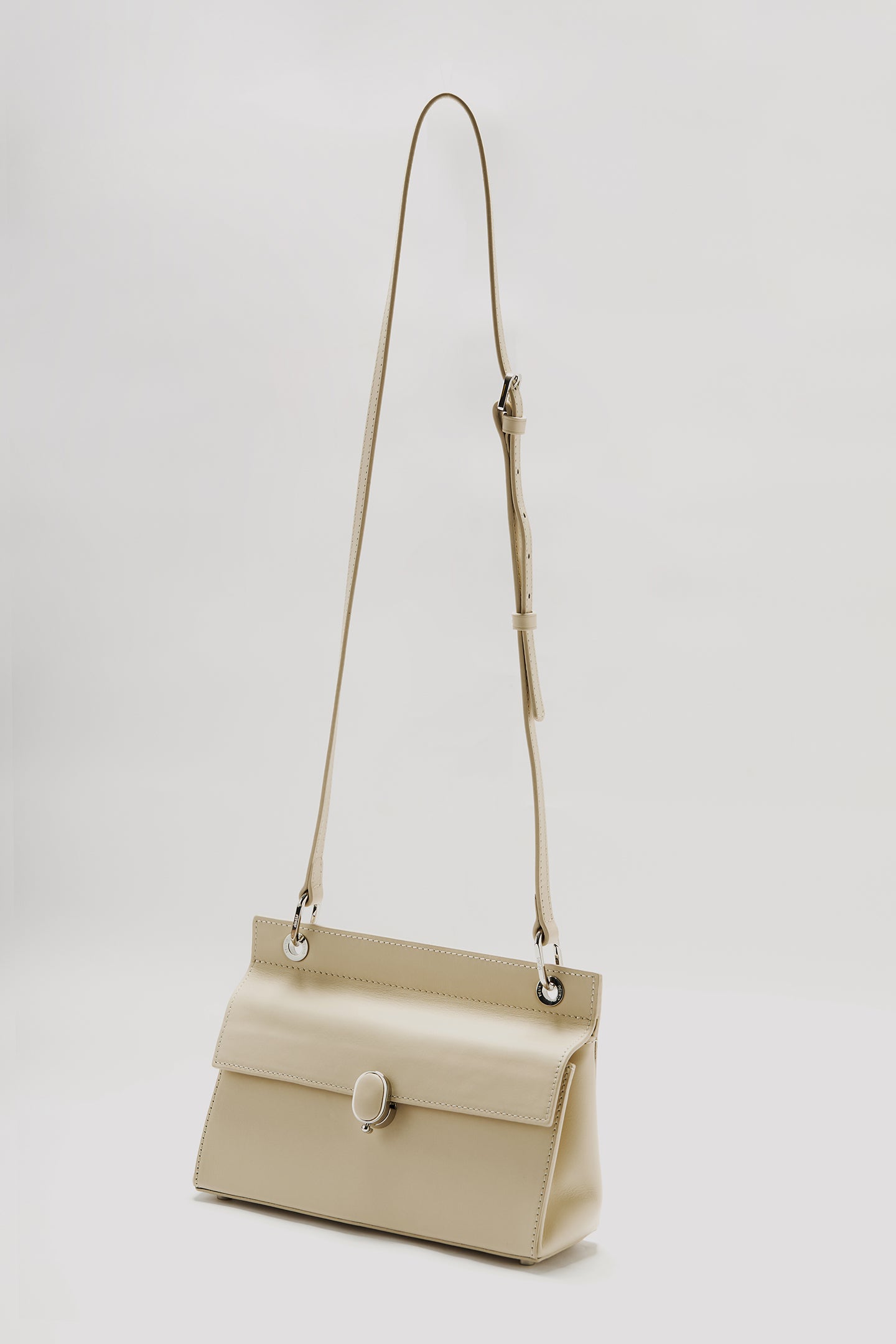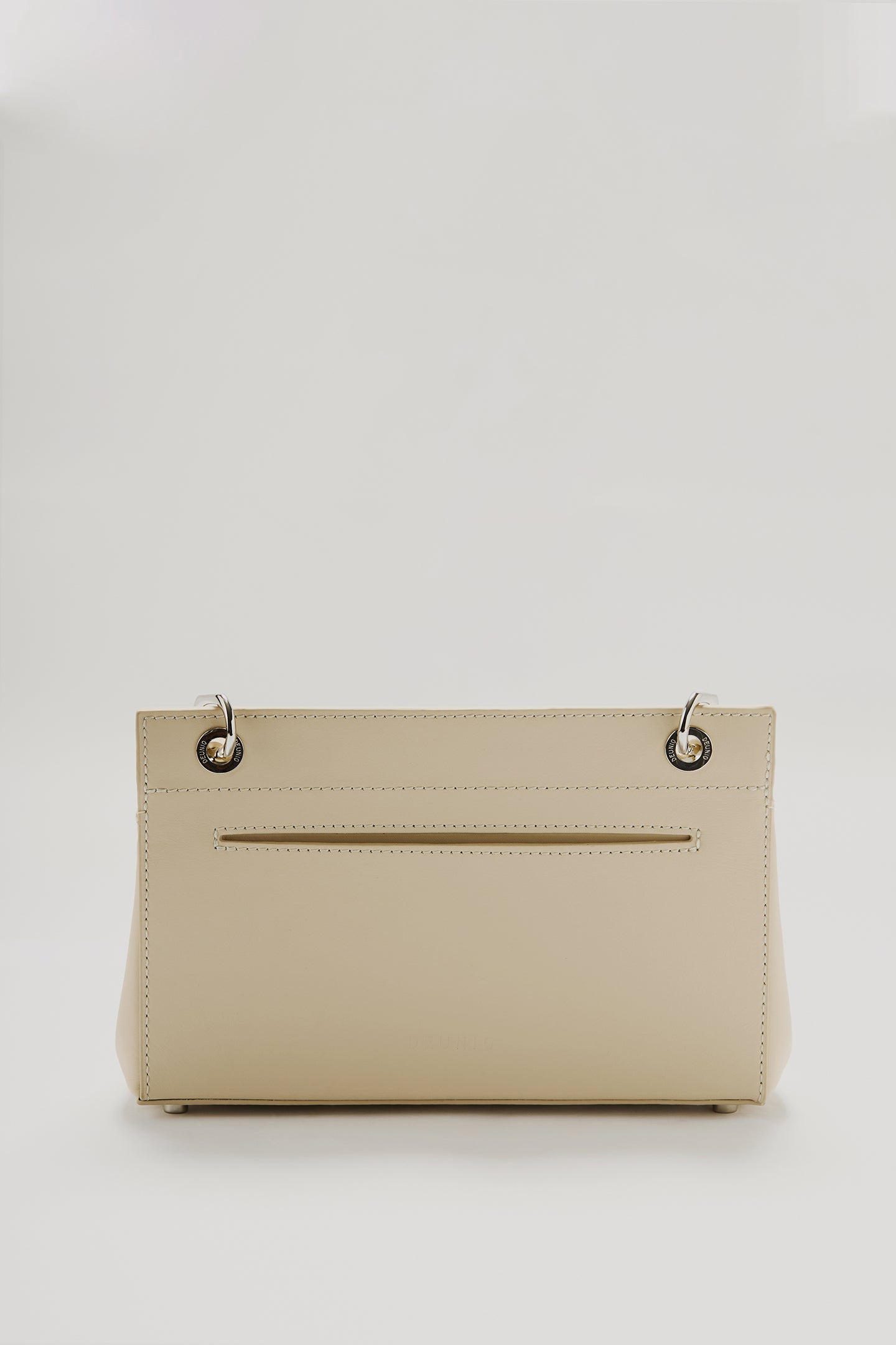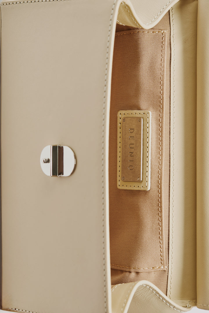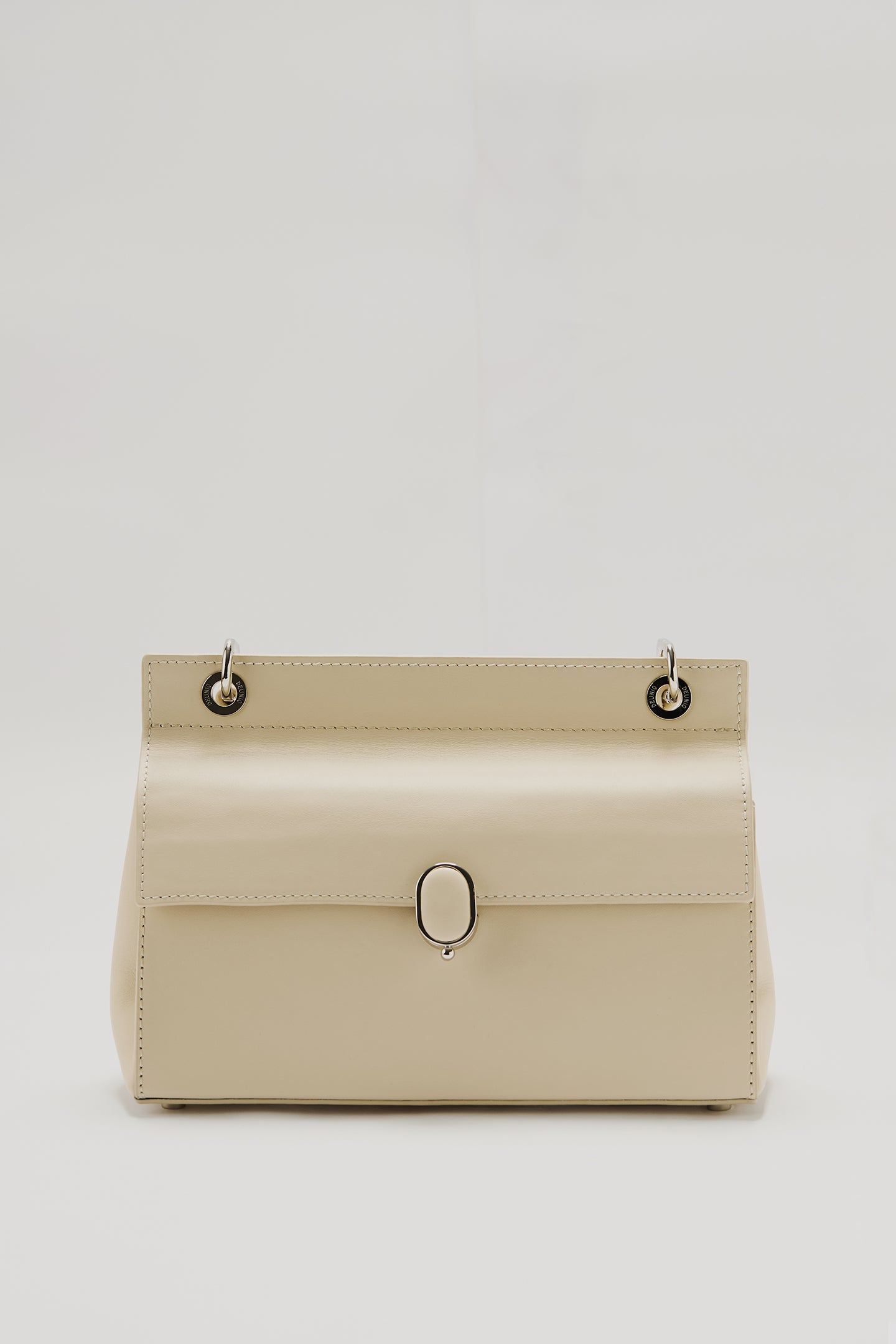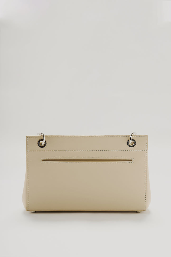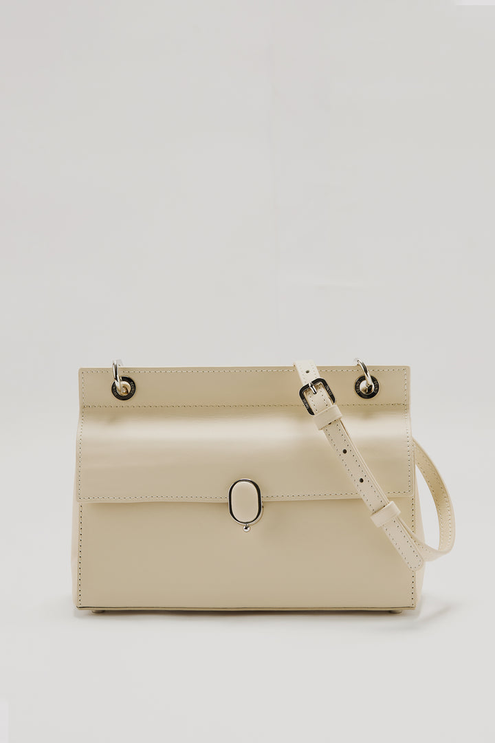 This bag is made from 100% genuine calf leather. It features a parel logo clasp on the front and a quilted logo detail on the base. Inside, there are two interior pockets. A metal brand plate is also placed inside. The strap is detachable and adjustable.