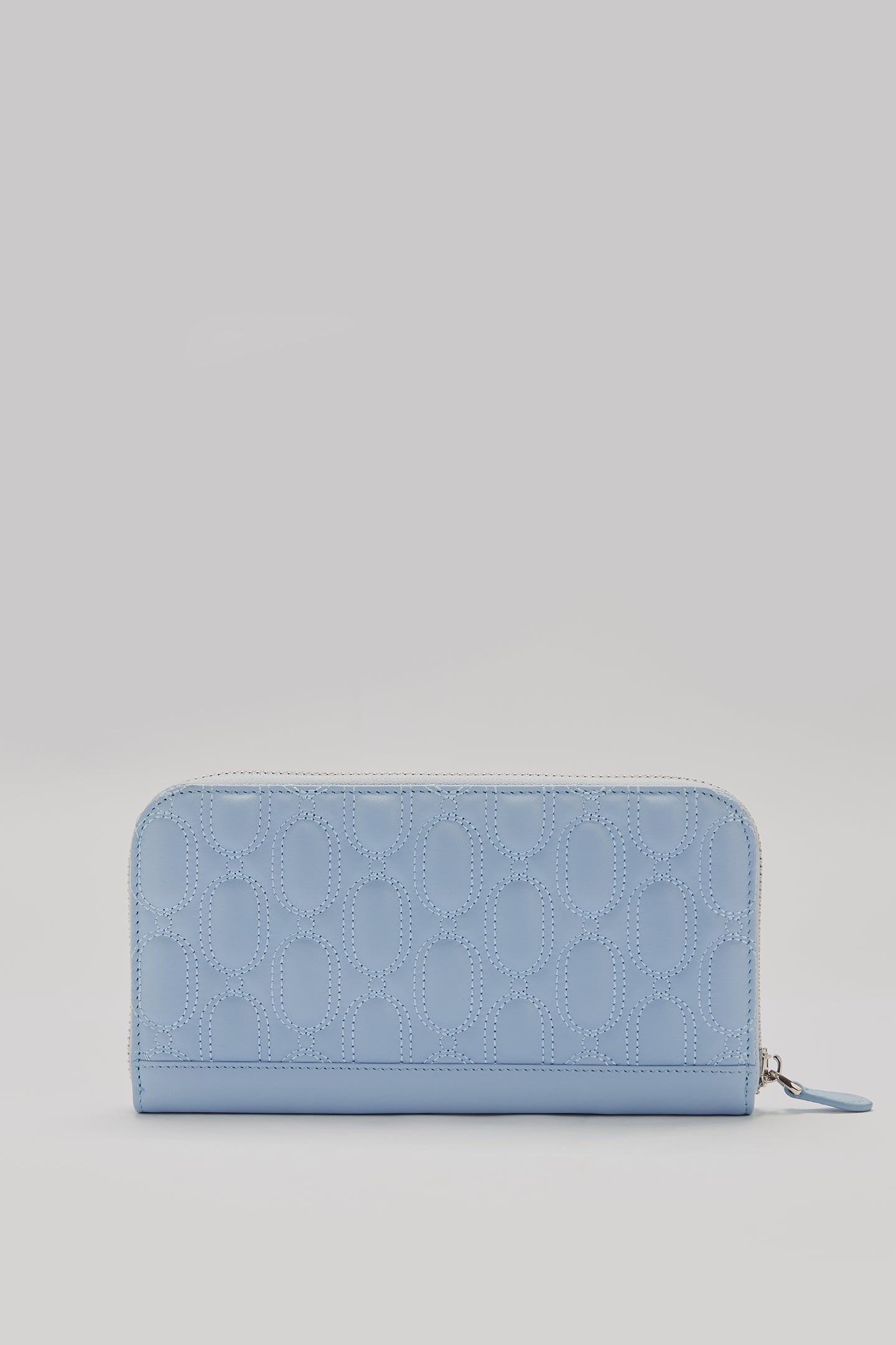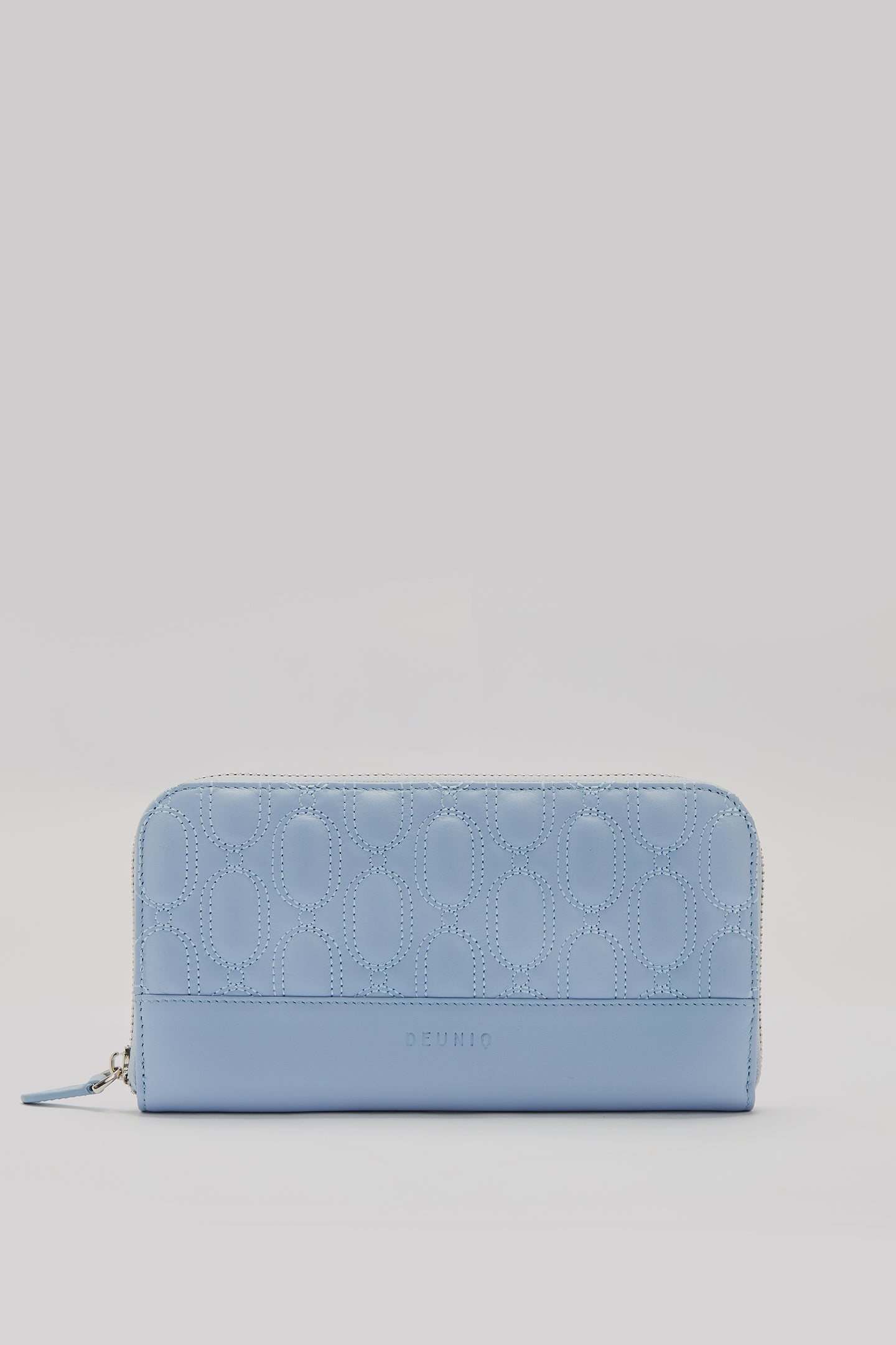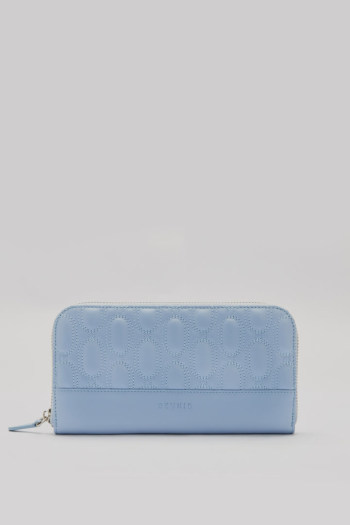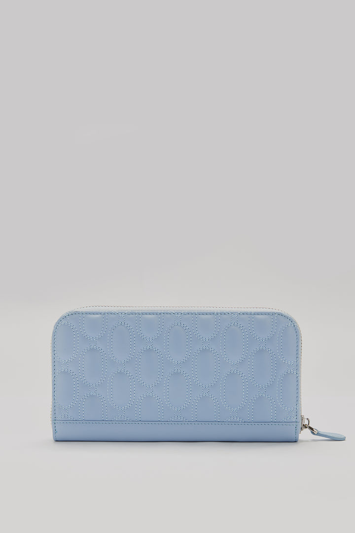 This wallet is made from 100% genuine calf leather. It features quilted logo detailing on the front and back. The interior includes card slots, bill compartments, and a zip coin pocket. It has a full-zip closure.