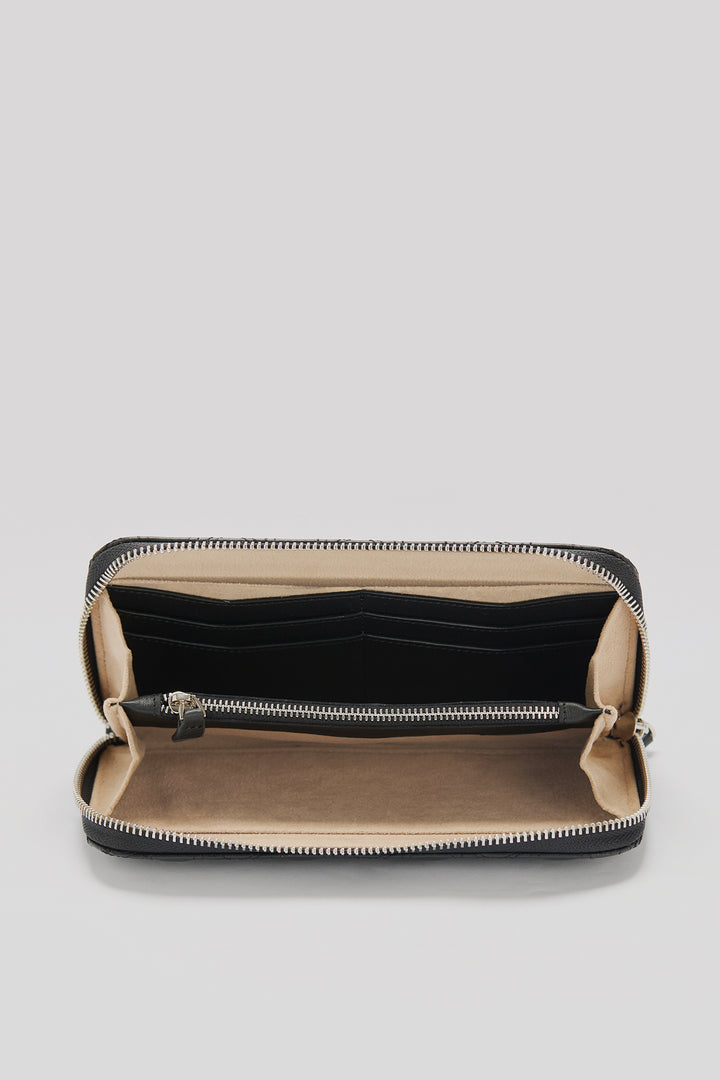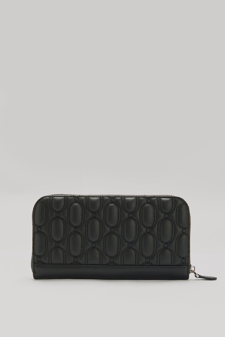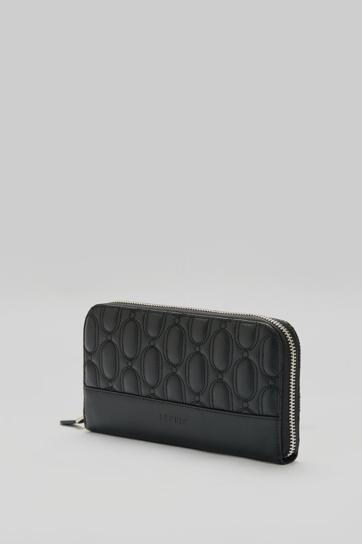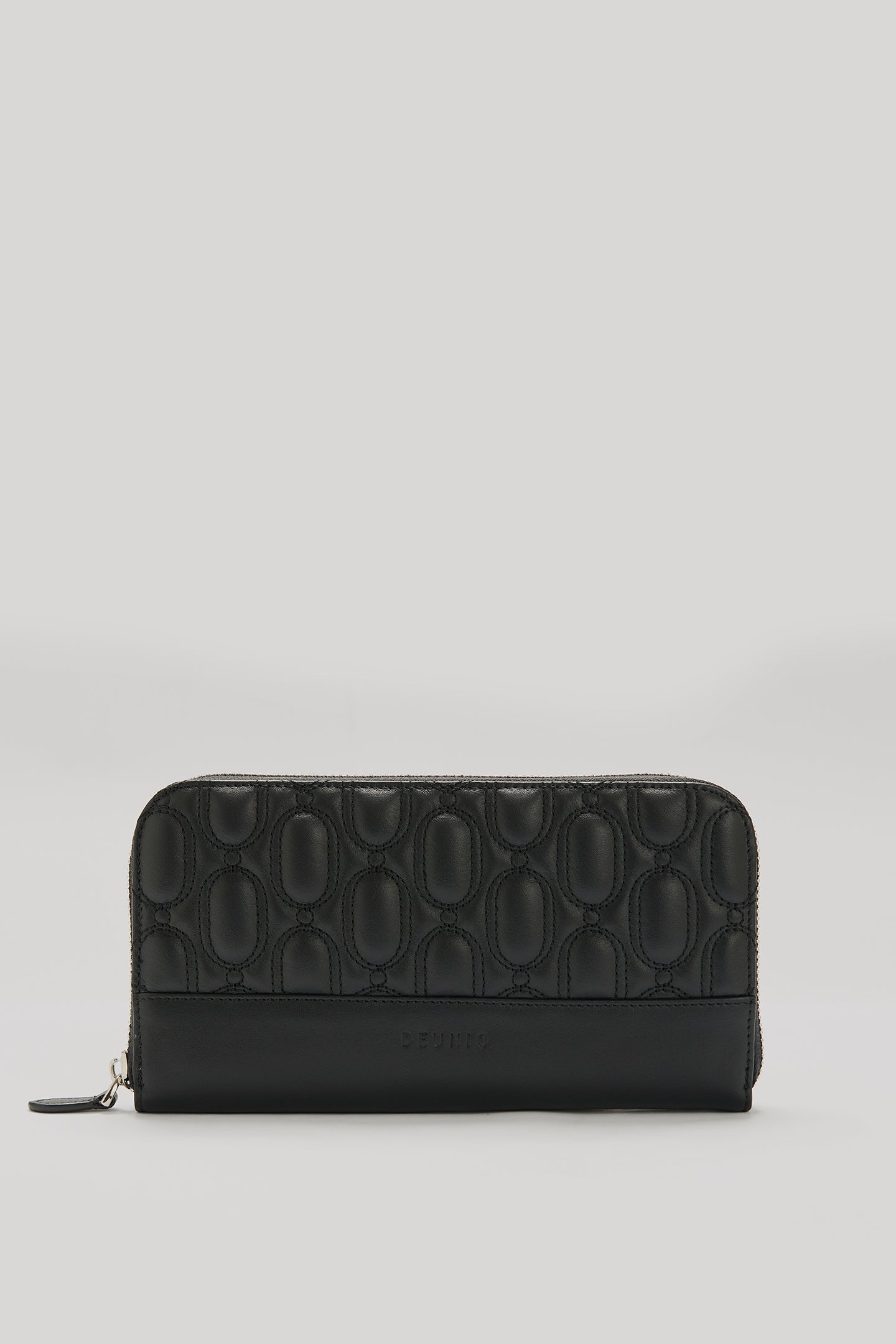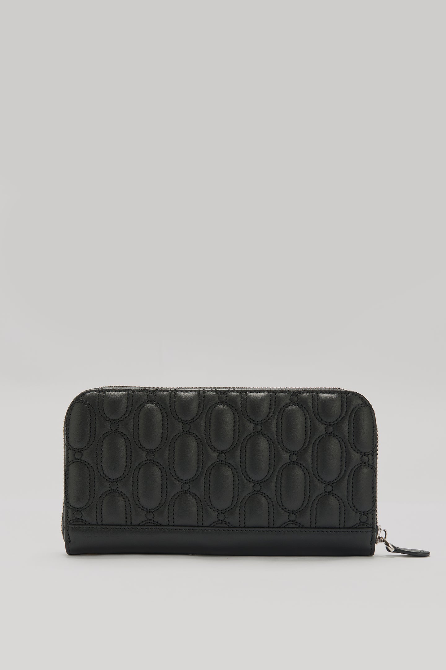 This wallet is made from 100% genuine calf leather. It features quilted logo detailing on the front and back. The interior includes card slots, bill compartments, and a zip coin pocket. It has a full-zip closure.