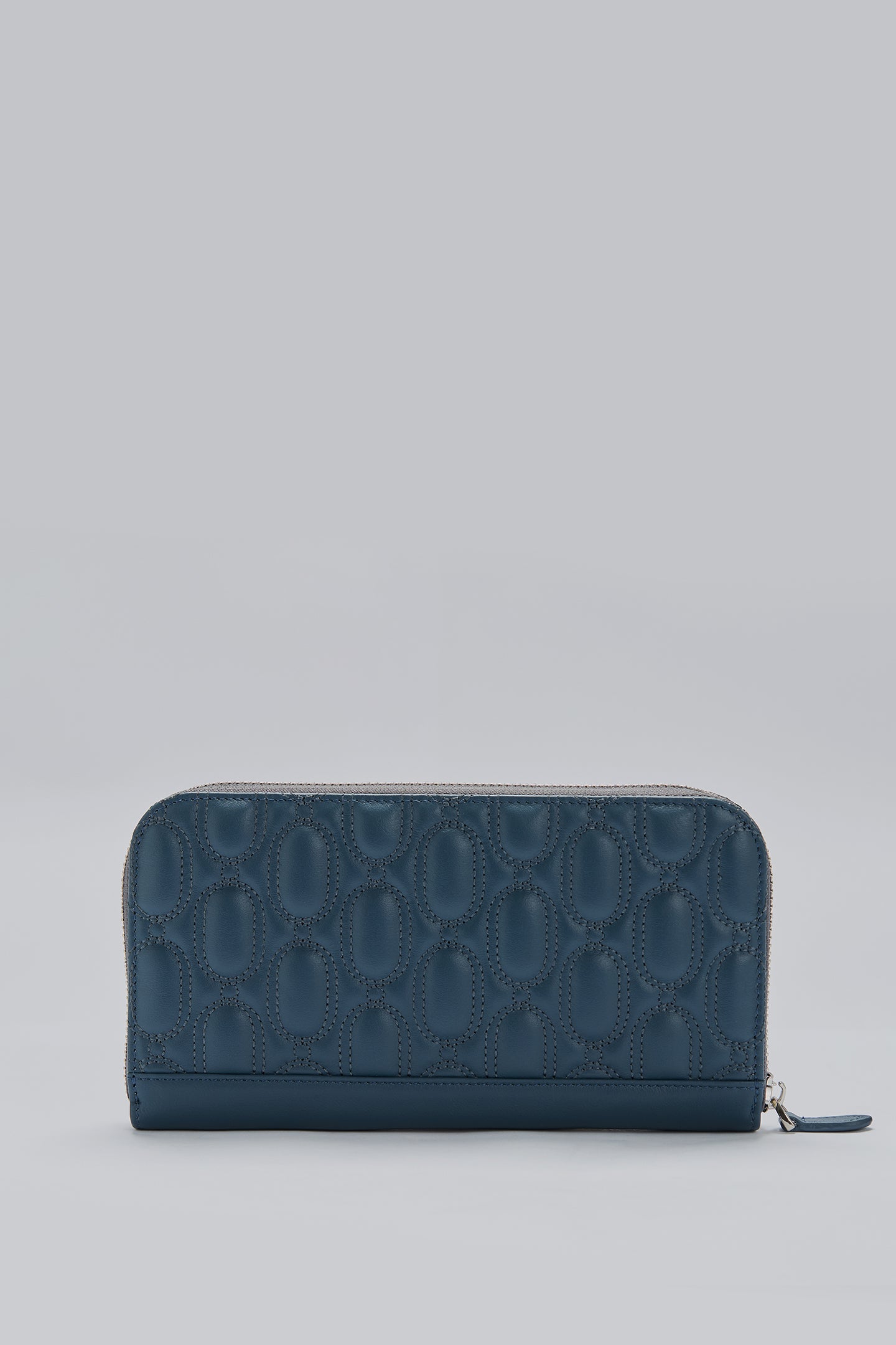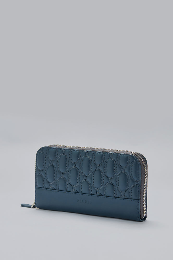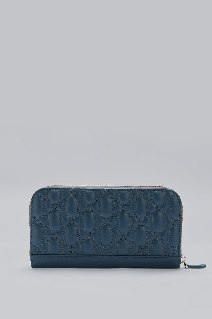 This wallet is made from 100% genuine calf leather. It features quilted logo detailing on the front and back. The interior includes card slots, bill compartments, and a zip coin pocket. It has a full-zip closure.