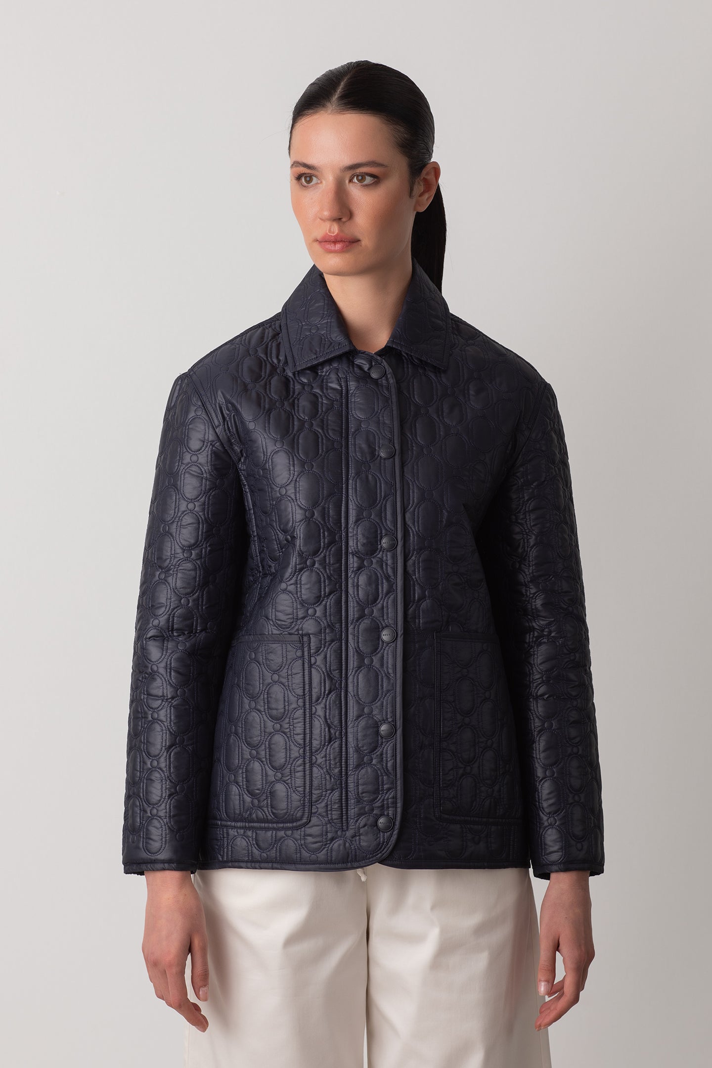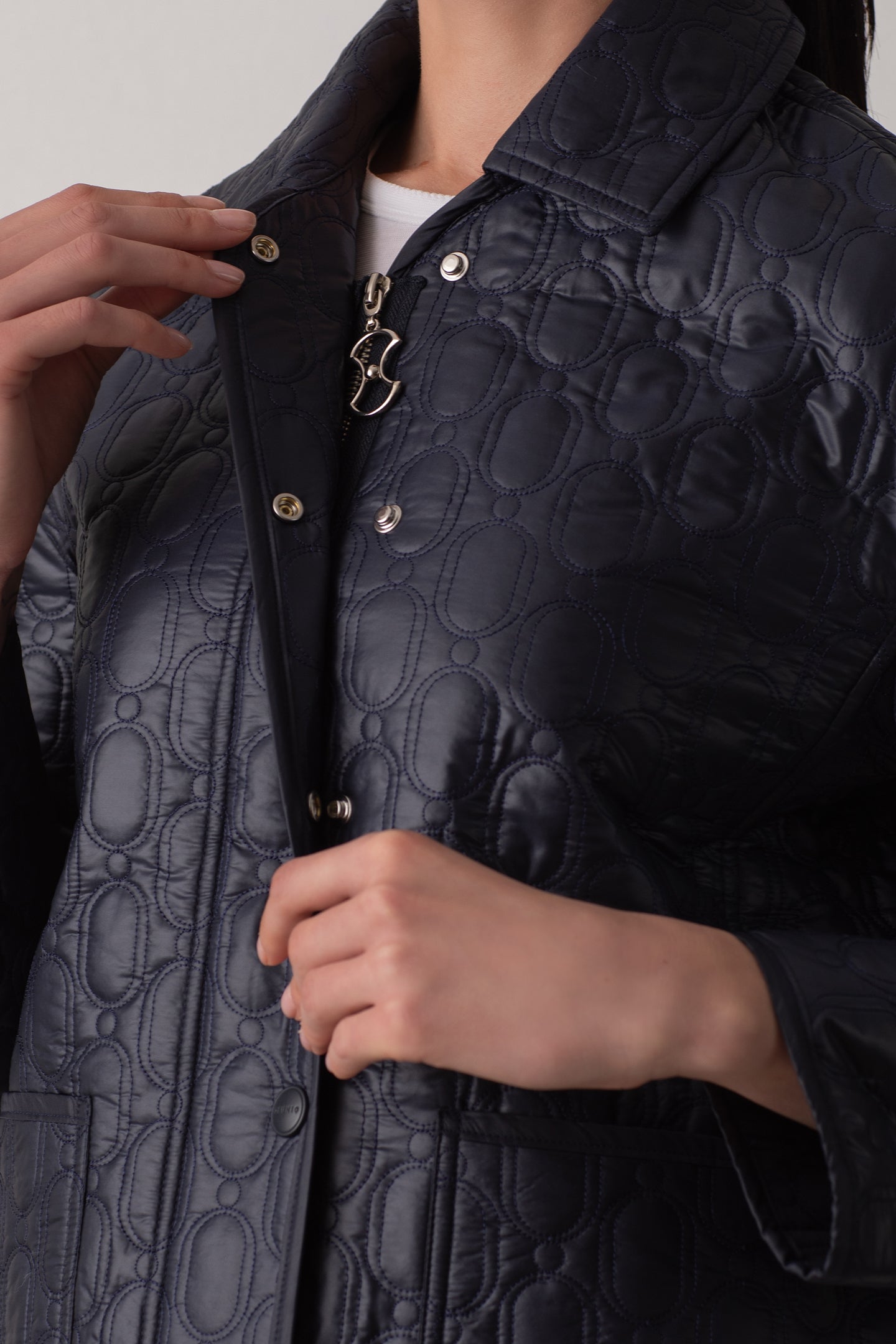 Quilted embroidered jacket with 'Parel' pattern and button with Deuniq.