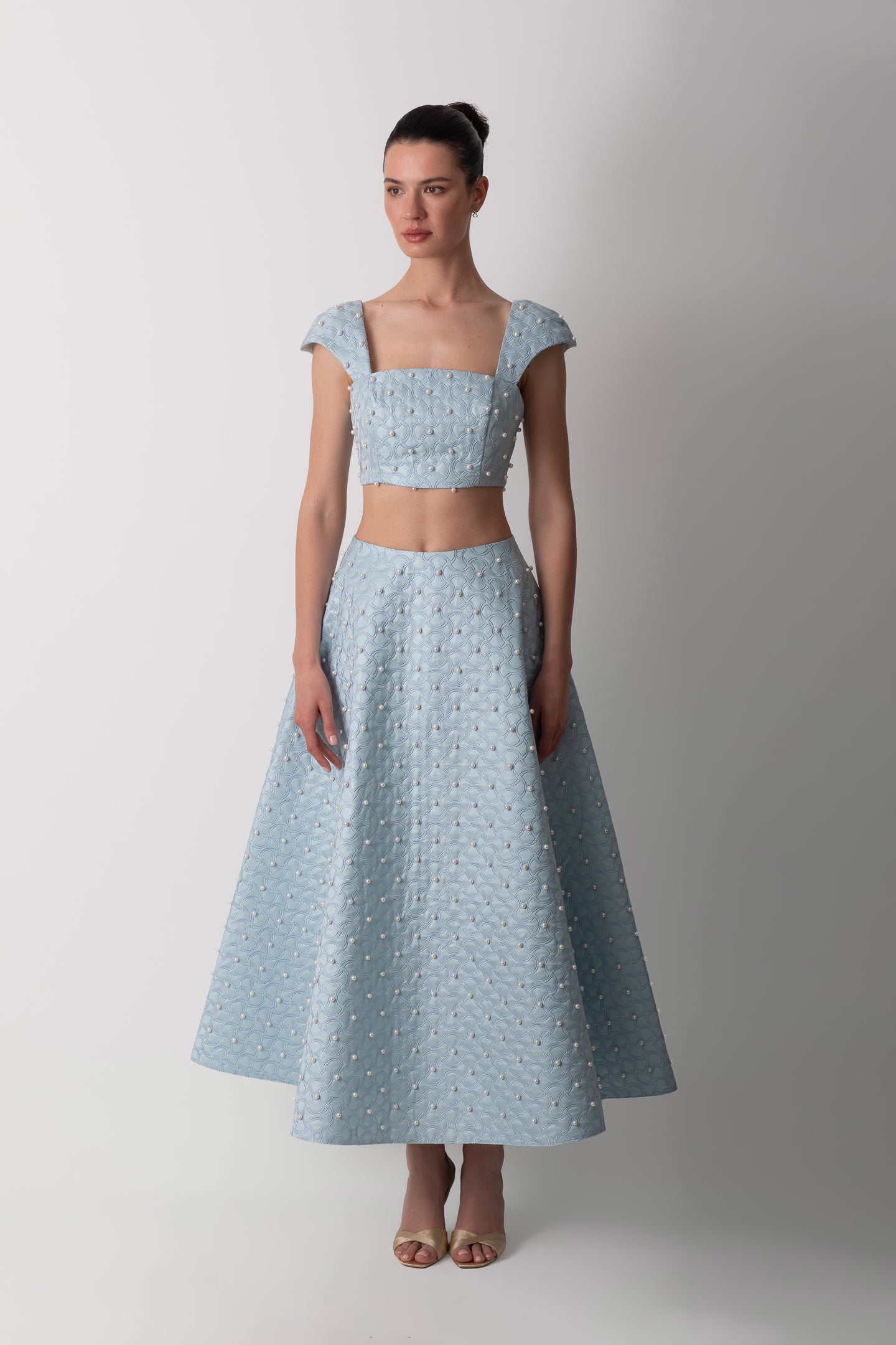 Pearl detailed, A-cut, silk skirt.