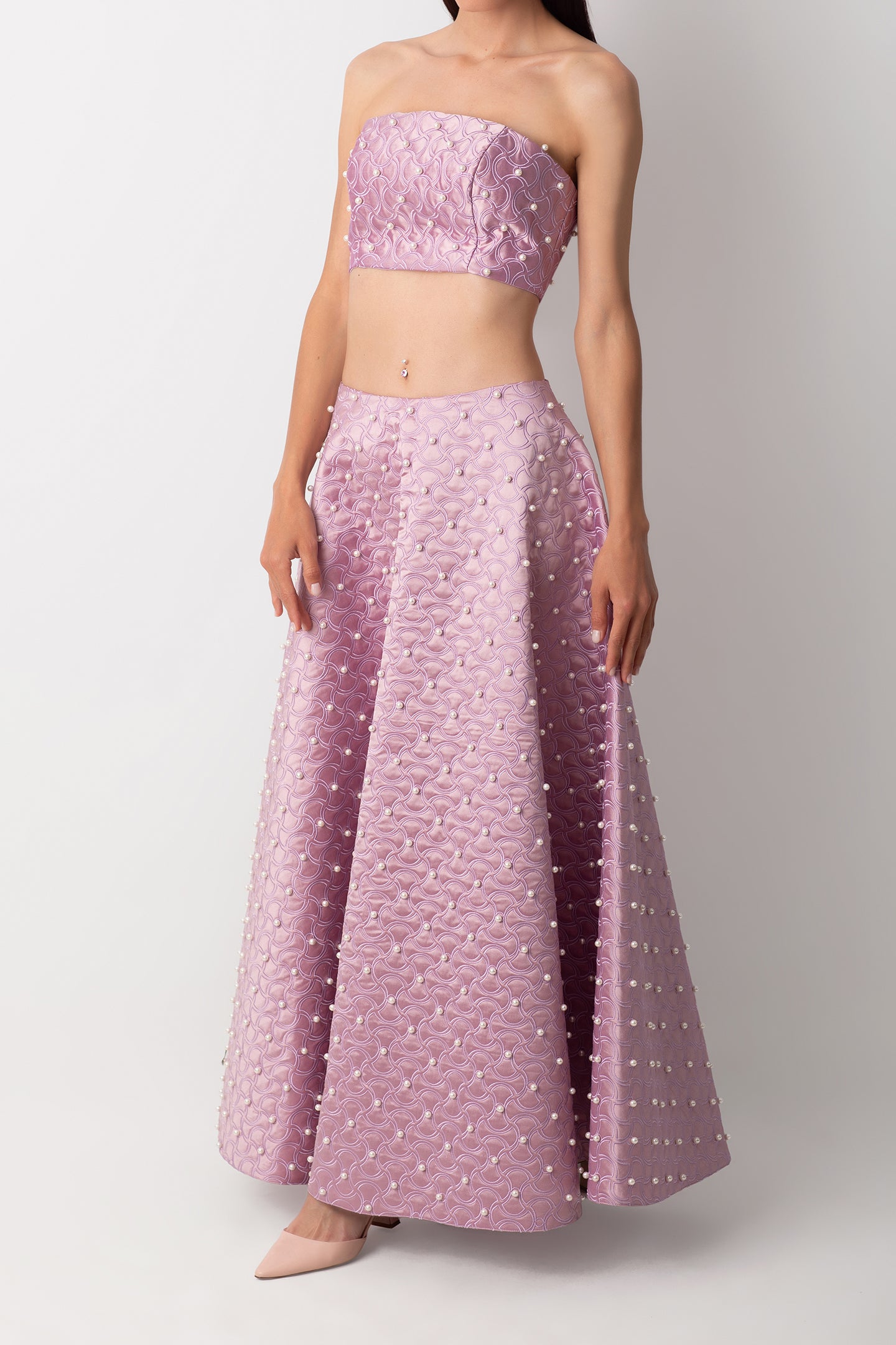 Silk strapless dress with pearl details.