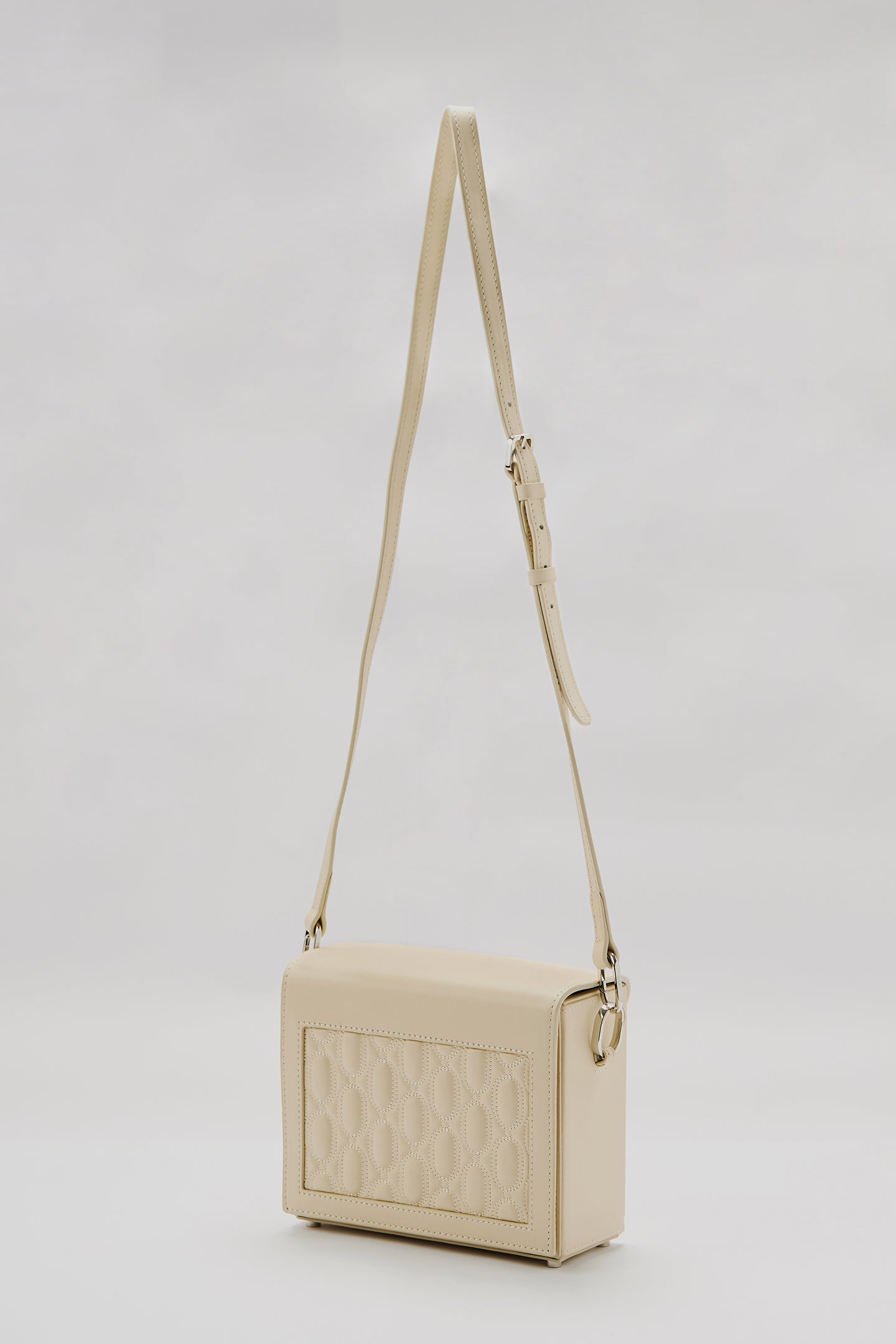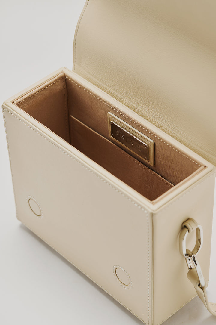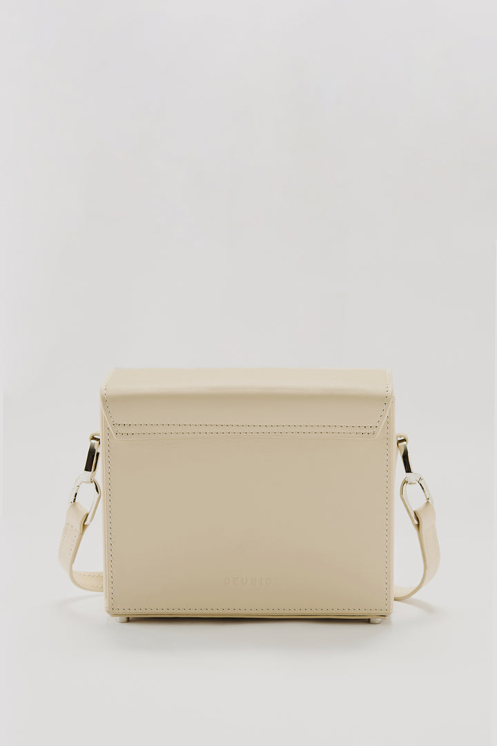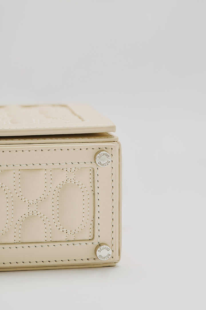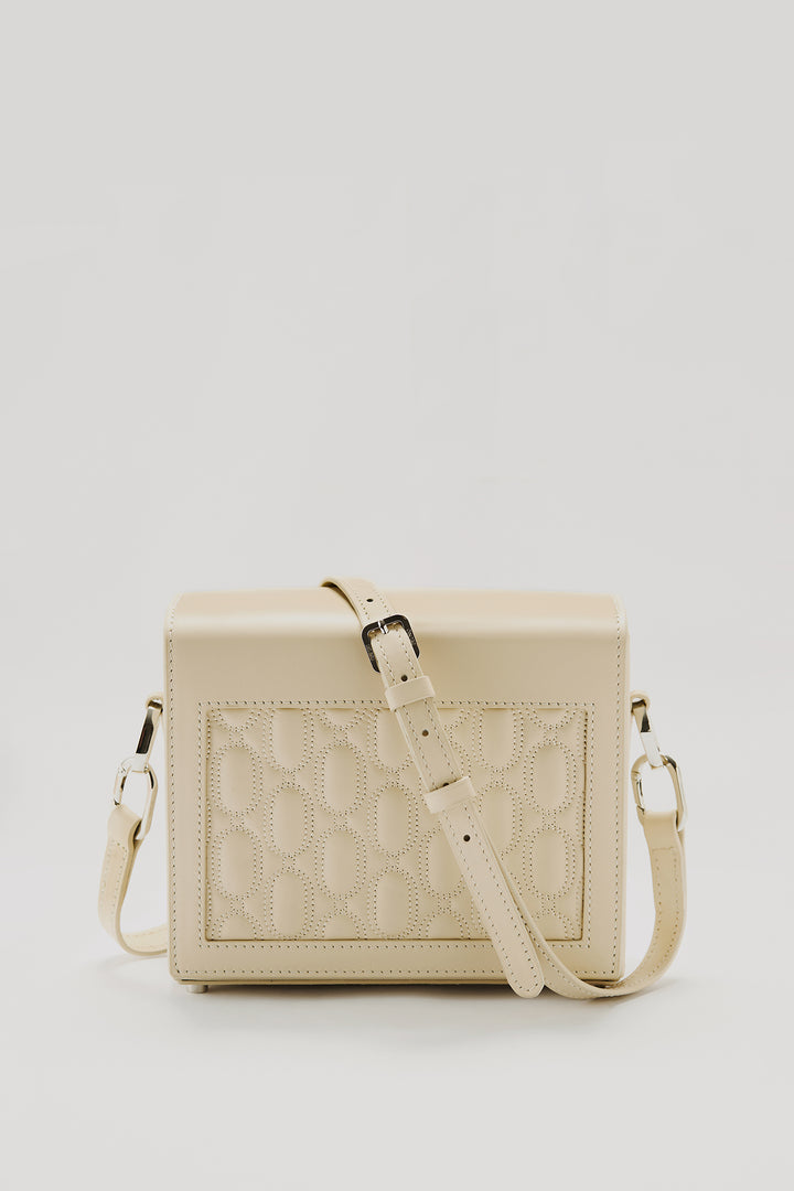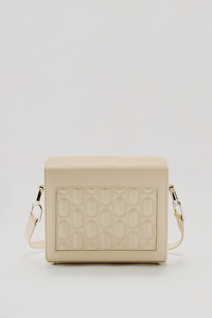 Crafted from 100% genuine calf leather in a cream tone, this bag enhances the brand’s timeless and minimal aesthetic with its quilted logo detail on the front. The interior features two pockets that help keep your daily essentials organized, while the metal logo detail adds a sophisticated touch to the design. Thanks to its adjustable and detachable shoulder strap, it easily adapts to different styling options.