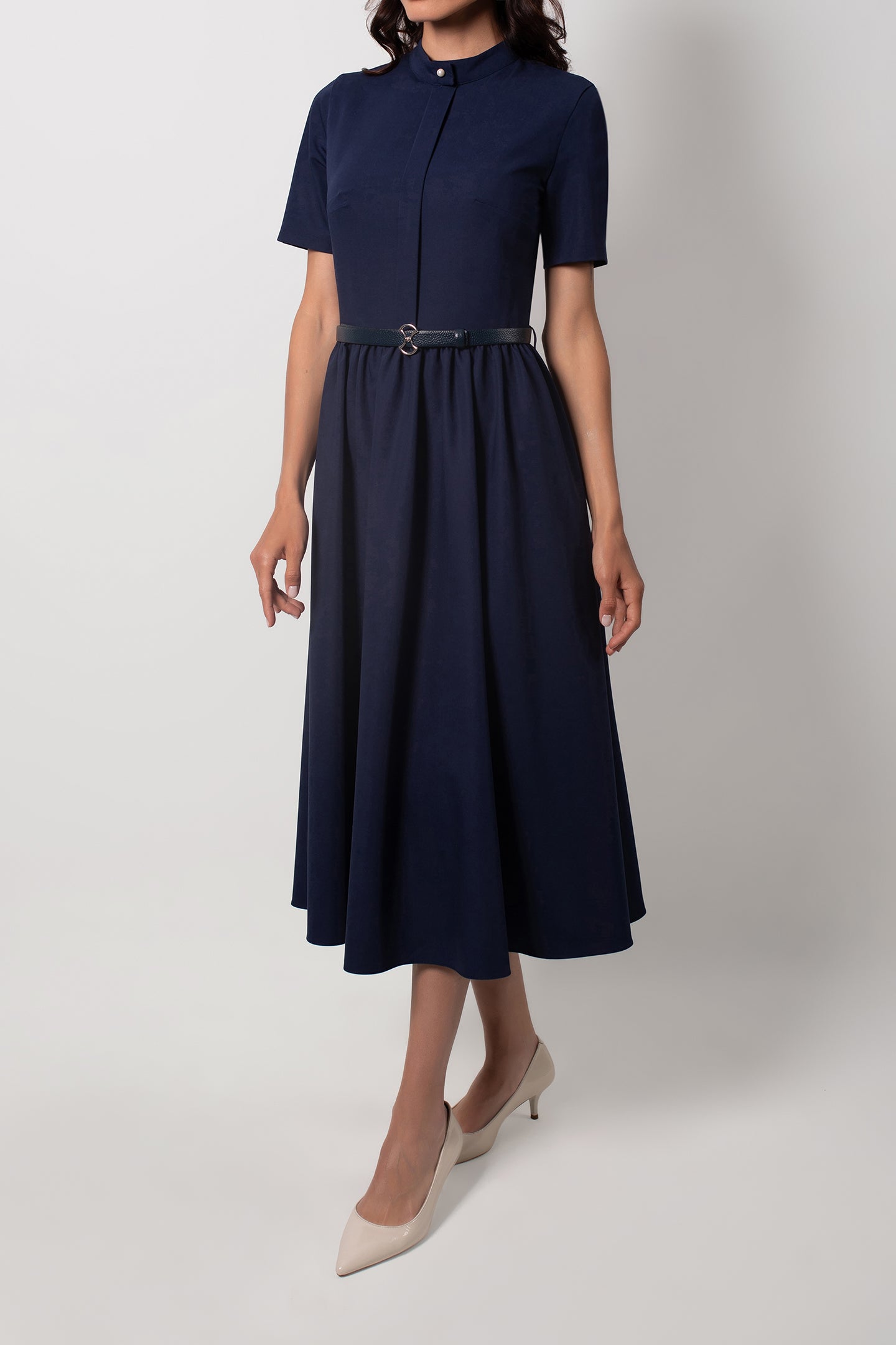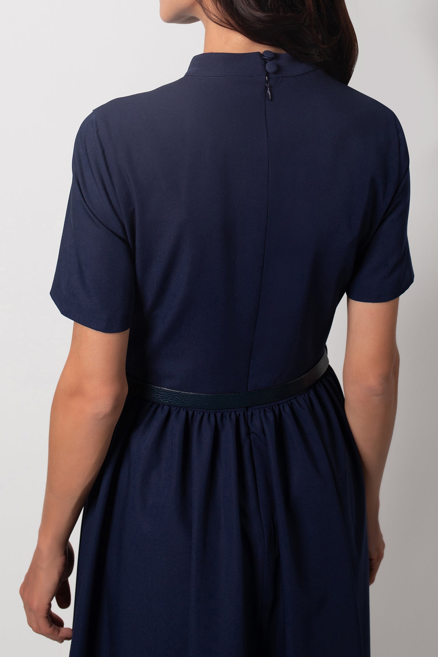 WAIST SHIRRED MIDI NAVY BLUE DRESS