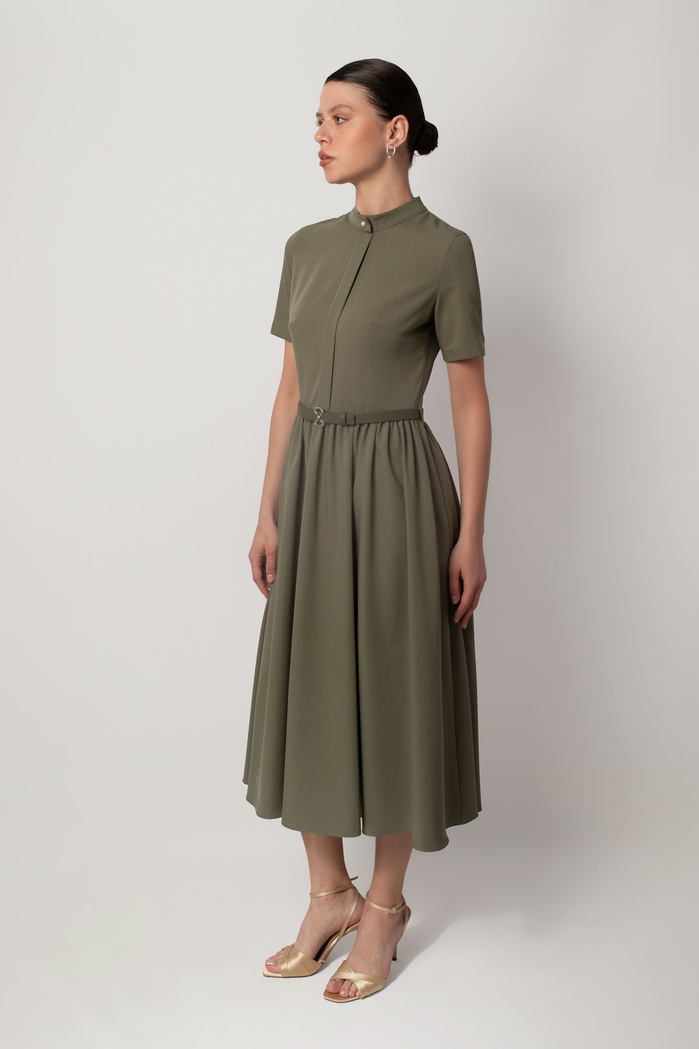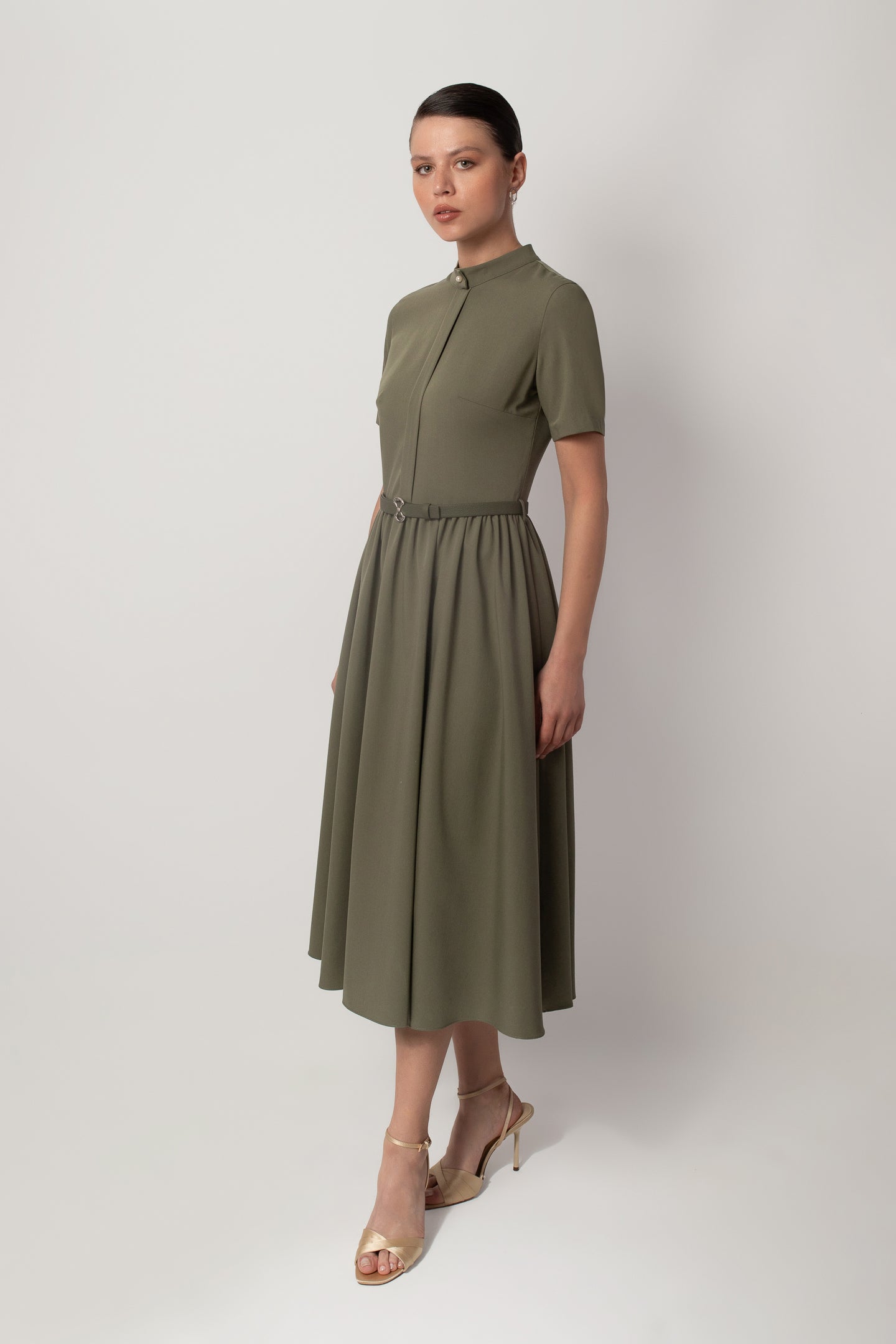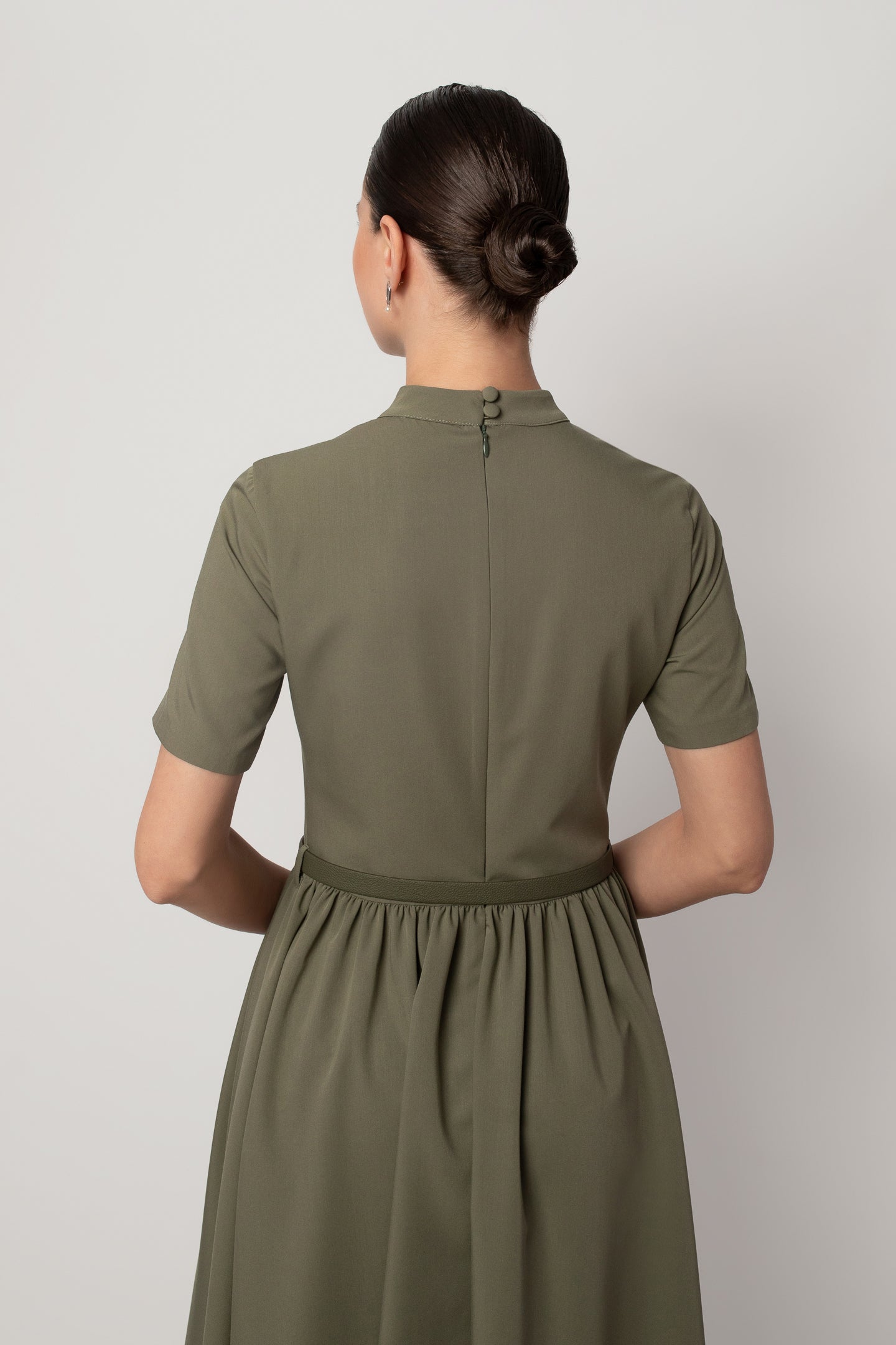 WAIST SHIRRED MIDI OIL GREEN DRESS