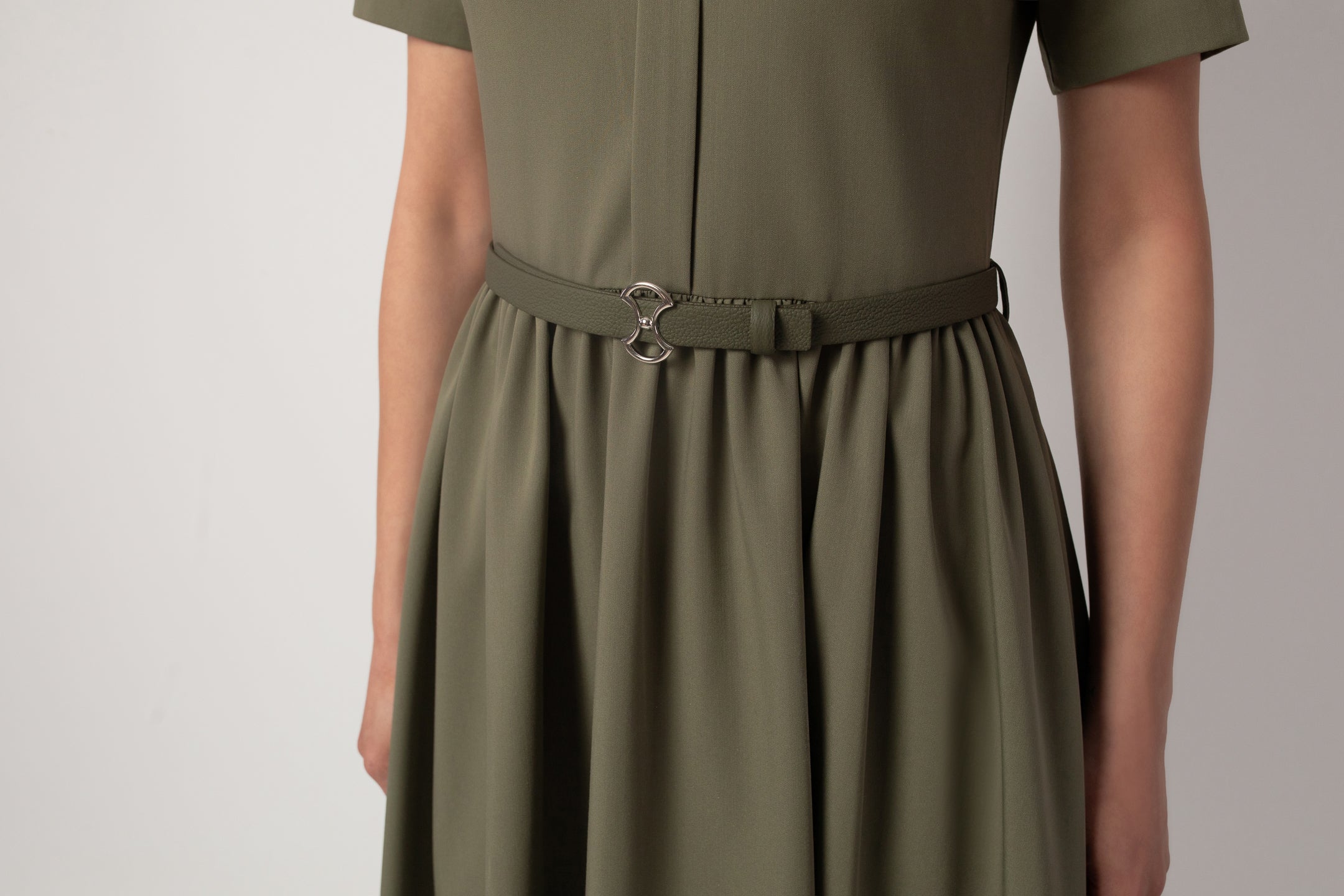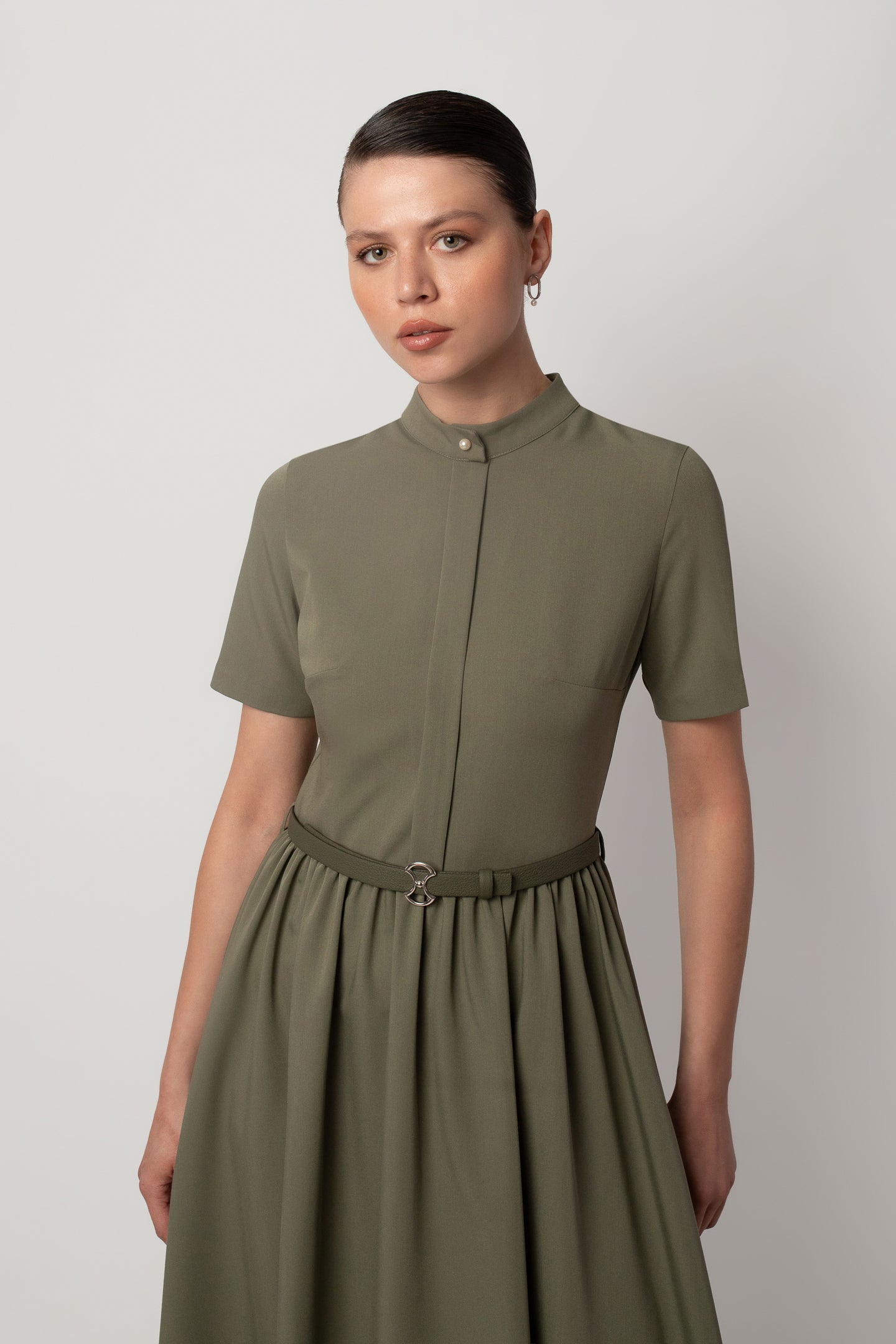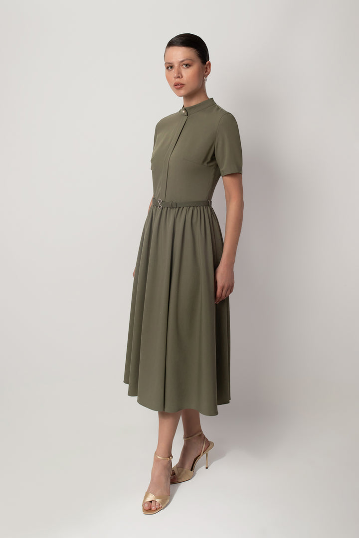WAIST SHIRRED MIDI OIL GREEN DRESS